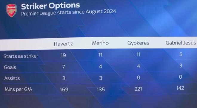 主持人:阿尔特塔现在的确拥有更多选择,可以说是四种锋线方案:热苏斯已经回归,哈弗茨也预计在2026年初、也就是几周后复出。这是他们自上赛季以来在英超的数据贡献。底部显示的是这四名球员“每分钟参与进球(进球+助攻)”的效率。可以看出,梅里诺目前可能是效率最高的,而哲凯赖什暂时最低。在这四人中,你认为阿尔特塔最终会依靠谁帮助球队赢得本赛季冠军?